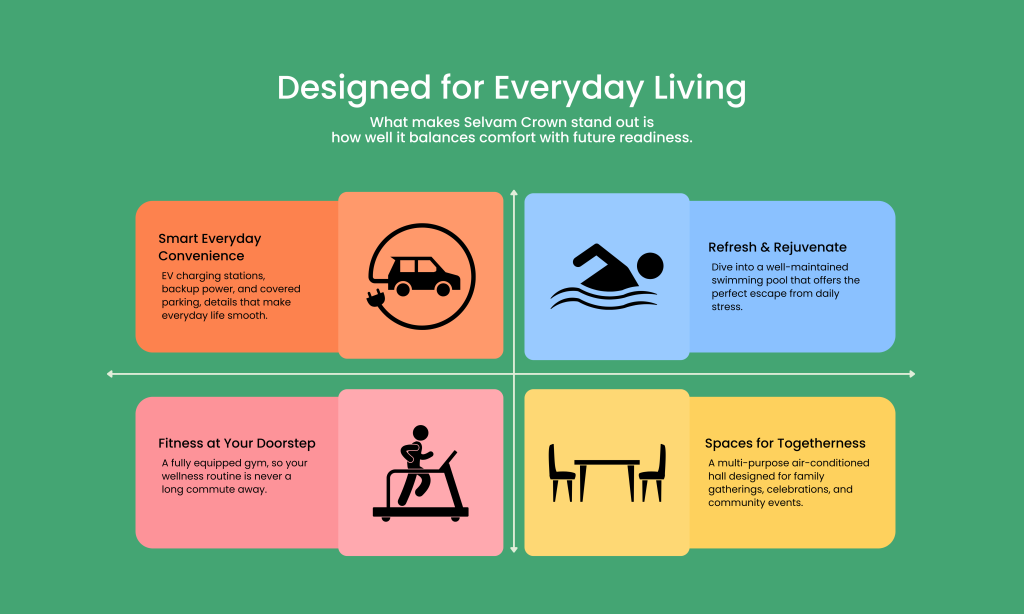 Homes aren’t just about where you live, but how you live. Selvam Crown has been designed with a long-term view,ensuring you don’t just buy into a home for today, but one that stays relevant for the next decade. EV charging, modern security, and community amenities make sure your lifestyle is never left behind as the world changes.